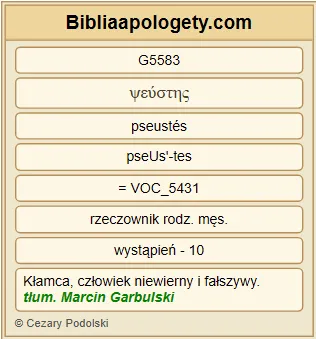 | L07 | 1J5_10 | Kto wierzy G4100 w Syna G5207 Bożego G2316 , ten ma G2192 w sobie G1722 G1438 świadectwo G3141 . Kto zaś nie wierzy G3361 G4100 Bogu G2316 , uczynił Go G4160 kłamcą G5583 , bo G3754 nie uwierzył G4100 świadectwu G3141 , jakie Bóg G2316 dał G3140 o swoim Synu G4012 G846 G5207 . |