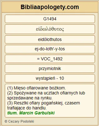 | L07 | 1Kor10_19 | Lecz G3767 po cóż to mówię G5346 ? Czy może G3754 jest czymś ofiara złożona bożkom G1494 ? Albo G2228 czy G3754 sam bożek G1497 jest czymś G5100 ? |