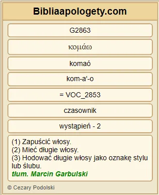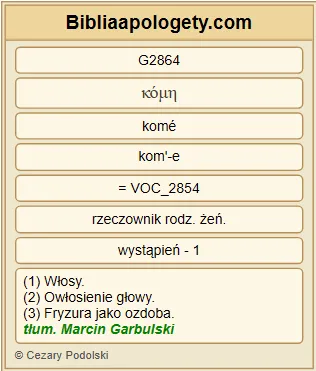 | L07 | 1Kor11_15 | Podczas gdy dla kobiety G1135 jest G2076 właśnie chwałą G1391 ? Włosy G2864 bowiem zostały jej G3588 dane G1325 za G473 okrycie G4018 . |