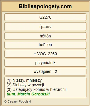 | L07 | 1Kor11_17 | Udzielając G3853 tych G5124 pouczeń G3853 nie G3756 pochwalam G1867 was, za to że G3754 schodzicie się G4905 nie G3756 na lepsze G1519 G2909 , ale G235 ku gorszemu G1519 G2276 . |