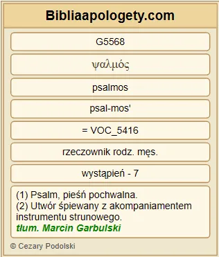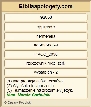 | L07 | 1Kor14_26 | Cóż więc G5101 G3767 pozostaje? Bracia G80 , kiedy się zbieracie G4905 , ma każdy G1538 z was już to dar śpiewania hymnów G5568 , już to łaskę nauczania G1322 albo objawiania rzeczy skrytych G602 , lub dar języków G1100 , albo wyjaśniania G2058 : wszystko G3956 niech służy G1096 ku zbudowaniu G4314 G3619 . |
