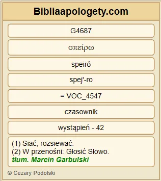 | L07 | 1Kor15_37 | To G3739 , co zasiewasz G4687 , nie jest od razu ciałem G4983 , którym ma się stać potem G1096 , lecz G235 zwykłym ziarnem G1131 , na przykład pszenicznym G1487 G5177 G4621 lub G2228 jakimś innym G3062 G5100 . |