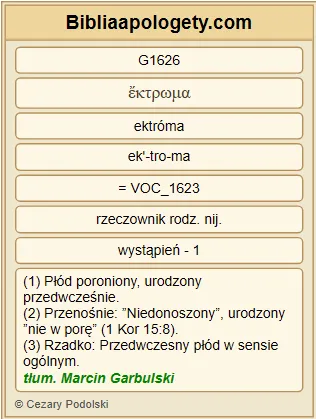| L07 | 1Kor15_8 | W końcu G2078 , już po wszystkich G3956 , ukazał się G3708 także i mnie G2504 jako poronionemu płodowi G1626 . |