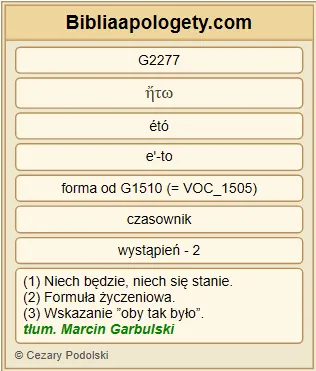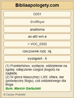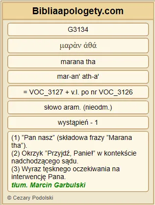 | L07 | 1Kor16_22 | Jeżeli G1487 ktoś G5100 nie kocha G5368 Pana G2962 , niech będzie wyklęty G331 . Maranatha G3134 . |