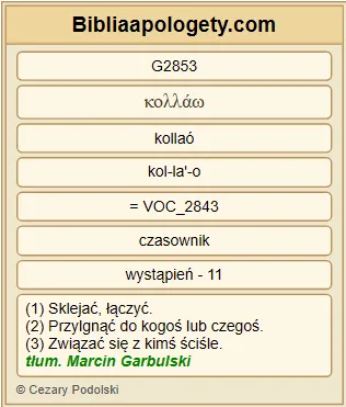 | L07 | 1Kor6_16 | Albo czyż nie G3756 wiecie G1492 , że ten, kto łączy się G2853 z nierządnicą G4204 , stanowi z nią jedno G1520 ciało G4983 ? Będą bowiem G1063 , jak jest powiedziane G5346 : dwoje G1417 jednym G3391 ciałem G4561 . |