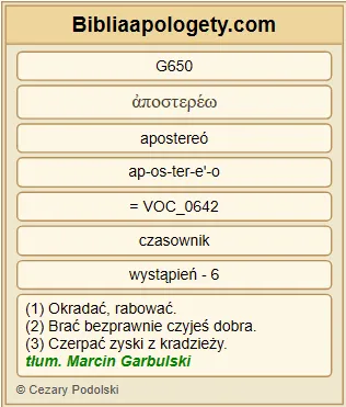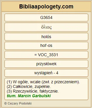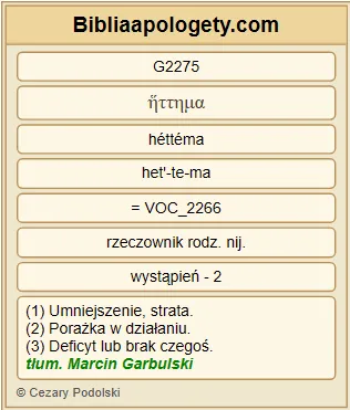 | L07 | 1Kor6_7 | Już samo G2235 to jest G2076 godne potępienia G3654 , że w ogóle zdarzają się G2192 wśród was sądowe sprawy G2917 . Czemuż nie G3780 znosicie raczej G3123 niesprawiedliwości G91 ? Czemuż nie G3780 ponosicie raczej G3123 szkody G650 ? |