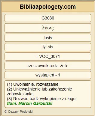 | L07 | 1Kor7_27 | Jesteś związany G1210 z żoną G1135 ? Nie G3361 usiłuj się uwolnić G3080 . Jesteś wolny G3089 od żony G1135 ? Nie G3361 szukaj G2212 żony G1135 . |