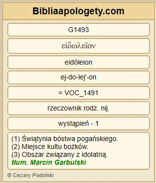 | L07 | 1Kor8_10 | Gdyby G1437 bowiem ujrzał G3708 ktoś G5100 ciebie G4571 , oświeconego G2192 wiedzą G1108 , jak zasiadasz do uczty G2621 w świątyni G1493 bałwochwalczej, czyżby to nie skłoniło G3618 również jego G846 słabego G772 sumienia G4893 do spożywania G2068 ofiar składanych bożkom G1494 ? |