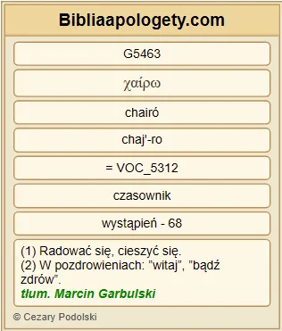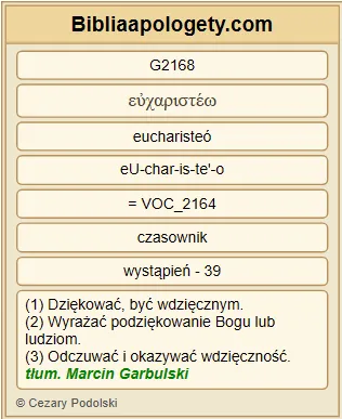 | L07 | 1Tes3_9 | Jakież G5101 bowiem dziękczynienie G2168 możemy złożyć G467 Bogu G2316 za was G5228 , za całą G3956 radość G5479 , jaką mamy G5463 przed G1715 Bogiem G2316 naszym G2257 z waszego powodu G1223 G5209 ? |