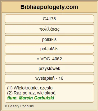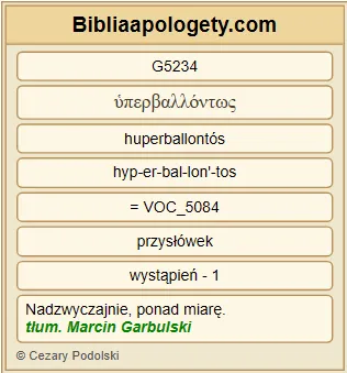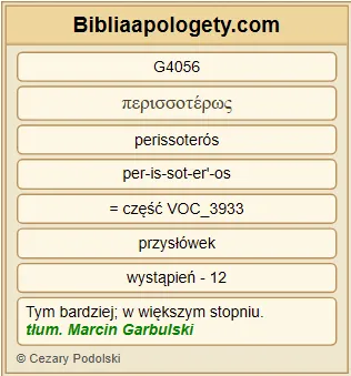 | L07 | 2Kor11_23 | Są G1526 sługami G1249 Chrystusa G5547 ? Zdobędę się G2980 na szaleństwo G3912 : Ja G1473 jeszcze bardziej G5228 ! Bardziej G4056 przez trudy G2873 , bardziej G4056 przez więzienia G5438 \ daleko bardziej G5234 przez chłosty G4127 , przez częste G4178 niebezpieczeństwa śmierci G2288 . |
