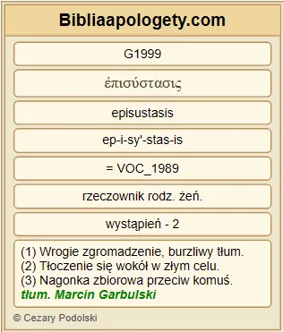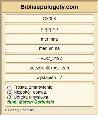 | L07 | 2Kor11_28 | nie mówiąc G5565 już o mojej codziennej G2596 G2250 udręce G1999 płynącej z troski G3308 o wszystkie G3956 Kościoły G1577 . |