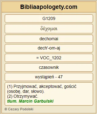 | L07 | 2Kor11_4 | Jeśli G1487 bowiem G1063 przychodzi G2064 ktoś G5100 i G2532 głosi G2784 wam G5213 innego G243 Jezusa G2424 , jakiegośmy G3739 wam G5213 nie G3756 głosili G2784 , lub G2228 bierzecie G2983 innego G2087 ducha G4151 , któregoście G3739 nie G3756 otrzymali G2983 , albo G2228 inną G2087 Ewangelię G2098 , którejście G3739 nie G3756 przyjęli G1209 — znosicie G430 to G5124 spokojnie G2573 . |