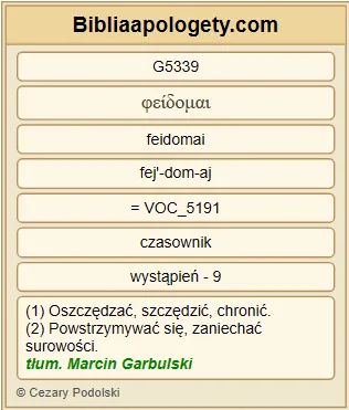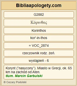 | L07 | 2Kor1_23 | A ja G1473 wzywam G1941 Boga G2316 na świadka G3144 mojej duszy G1909 G1699 G5590 , iż G3754 tylko aby was oszczędzić G5339 , nie G3765 przybyłem G2064 do Koryntu G1519 G2882 . |