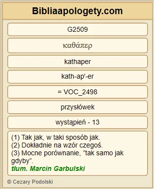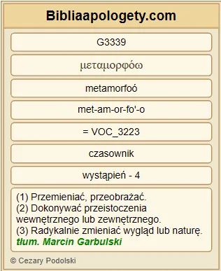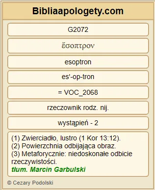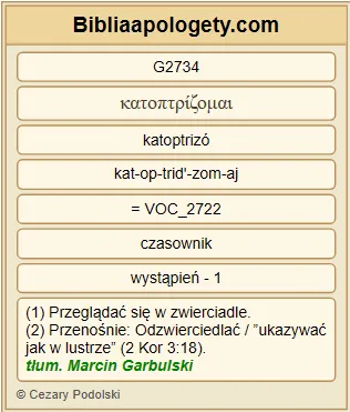 | L07 | 2Kor3_18 | My G2249 wszyscy G3956 z G3326 odsłoniętą G343 twarzą G4383 wpatrujemy się G2734 w G1519 jasność G1391 Pańską G2962 jakby G5613 w G1722 zwierciadle G2072 \ za sprawą G575 Ducha G4151 Pańskiego G2962 , coraz bardziej G1537 G3956 jaśniejąc G3339 , upodabniamy się G3339 do G1519 Jego G846 obrazu G1504 . |