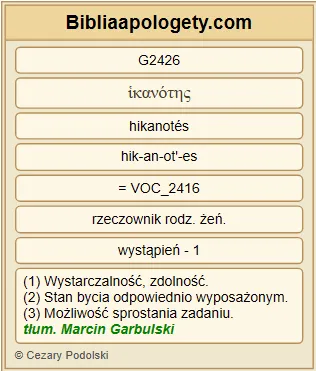 | L07 | 2Kor3_5 | Nie G3756 żebyśmy uważali G3049 , że G3754 jesteśmy G2070 w stanie G2425 pomyśleć G3049 coś G5100 sami z siebie G1438 , lecz G235 [wiemy], że G3754 ta możność G2426 nasza G2257 jest G2076 z G1537 Boga G2316 . |