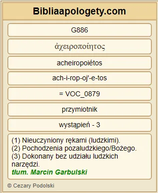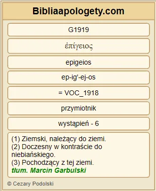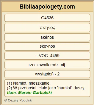 | L07 | 2Kor5_1 | Wiemy G1492 bowiem G1063 , że G3754 jeśli G1437 nawet G2532 zniszczeje G2647 nasz G2257 przybytek G3614 doczesnego G1919 zamieszkania G3614 , będziemy mieli G2192 mieszkanie G3619 od G1537 Boga G2316 , dom G3614 nie G3756 ręką uczyniony G886 , lecz G235 wiecznie G166 trwały G3306 w G1722 niebie G3772 . |