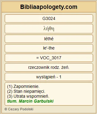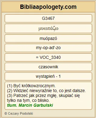 | L07 | 2P1_9 | Komu bowiem G1063 ich G5023 brak G3361 G3918 , jest G2076 ślepym G5185 , krótkowidzem G3467 i zapomniał G3024 o oczyszczeniu G2512 dawnych G3819 grzechów G266 swoich G846 . |