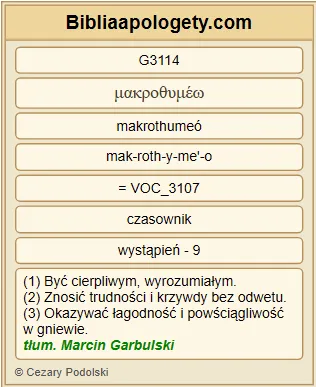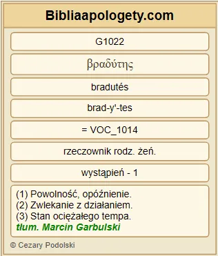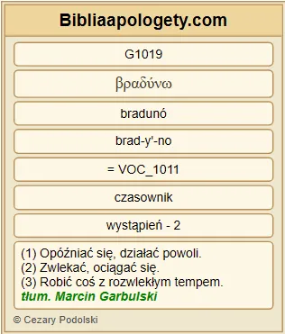 | L07 | 2P3_9 | Nie zwleka G1019 Pan G2962 z wypełnieniem obietnicy G1860 – bo niektórzy G5100 są przekonani G2233 , że Pan zwleka G1022 – ale On jest cierpliwy G3114 w stosunku do was G5209 . Nie chce G1014 bowiem, by ktokolwiek G5100 zginął G622 , ale by wszyscy G3956 przyszli G5562 do nawrócenia G3341 . |