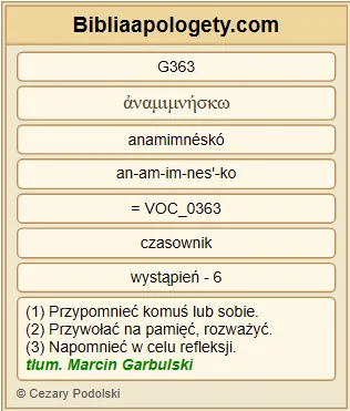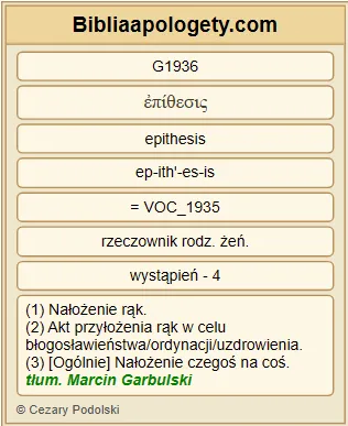 | L07 | 2Tm1_6 | Z tej właśnie przyczyny G1223 G3739 przypominam G363 ci G4571 , abyś rozpalił na nowo G329 charyzmat G5486 Boży G2316 , który G3739 jest G2076 w tobie G1722 G4671 przez G1223 nałożenie G1936 moich G3450 rąk G5495 . |