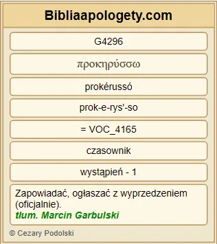 | L07 | Dz13_24 | Przed Jego przyjściem G1529 Jan G2491 głosił G4296 chrzest G908 nawrócenia G3341 całemu G3956 ludowi G2992 izraelskiemu G2474 . |