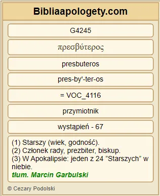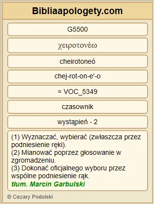 | L07 | Dz14_23 | Kiedy w każdym G2596 Kościele G1577 ustanowili G5500 im starszych G4245 , i pośród modlitw G4336 oraz postów G3521 , polecili G3908 ich Panu G2962 , w którego G3739 uwierzyli G4100 . |