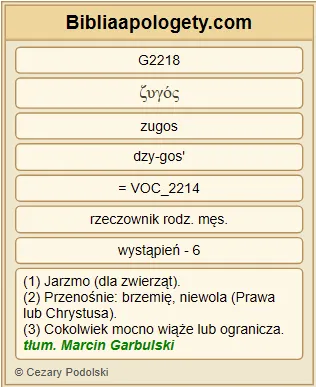 | L07 | Dz15_10 | Dlaczego G5101 więc teraz Boga G2316 wystawiacie na próbę G3985 , wkładając G2007 na uczniów G3101 jarzmo G2218 , którego ani ojcowie G3962 nasi, ani my G2249 sami nie mieliśmy siły G2480 dźwigać G941 ? |
