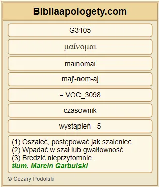 | L07 | Dz26_24 | (24) Gdy się tak bronił G626 , Festus G5347 zawołał G5346 donośnym G3173 głosem G5456 : Tracisz rozum G3105 , Pawle G3972 ! Wielka nauka G1121 doprowadza cię do obłędu G3130 . |