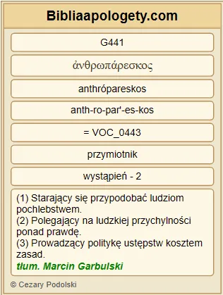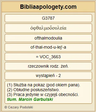 | L07 | Ef6_6 | nie G3361 służąc tylko dla oka G3787 , by ludziom się podobać G441 , lecz G235 jako G5613 niewolnicy G1401 Chrystusa G5547 , którzy G4160 z duszy G1537 G5590 pełnią wolę G2307 Boga G2316 , |