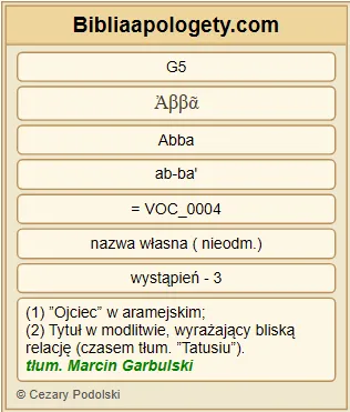 | L07 | Ga4_6 | Na dowód G3754 tego, że jesteście G2075 synami G5207 , Bóg G2316 wysłał G1821 do G1519 serc G2588 naszych G2257 Ducha G4151 Syna G5207 swego G846 , który woła G2896 : Abba G5 , Ojcze G3962 ! |