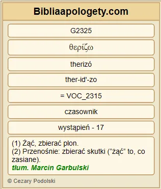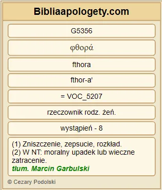| L07 | Ga6_8 | Kto G3588 sieje G4687 w G1519 ciele swoim G1438 , jako plon G2325 ciała G4561 zbierze zagładę G5356 \ kto zaś G1161 sieje G4687 w duchu G1519 , jako plon G2325 ducha G4151 zbierze życie wieczne G166 G2222 . |