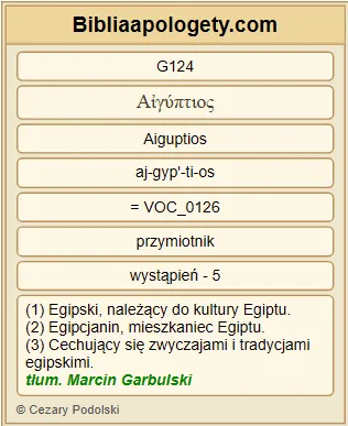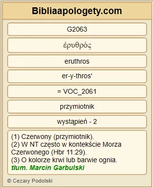 | L07 | Hbr11_29 | Przez G1223 wiarę G4102 przeszli G1224 Morze G2281 Czerwone G2063 jak G5613 po suchej G3584 ziemi G1093 , a gdy G3753 Egipcjanie G124 spróbowali G3984 to uczynić G2983 , potonęli G2666 . |
