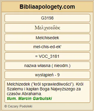 | L06 | Hbr7_10 | Był bowiem jeszcze w lędźwiach praojca swego, gdy Melchizedek wyszedł mu na spotkanie. | |||||||||||
