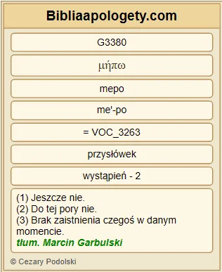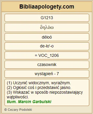 | L07 | Hbr9_8 | Przez to G5124 pokazuje G1213 Duch Święty G40 , że jeszcze G3380 nie została otwarta G5319 droga G3598 do Miejsca Świętego G39 , dopóki G2089 istnieje G2192 pierwszy G4413 przybytek G4633 . |