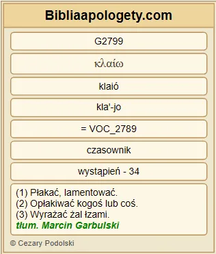 | L07 | J11_33 | Gdy więc G3767 Jezus G2424 ujrzał G3708 , jak G846 płakała G2799 ona G846 i G2532 Żydzi G2453 , którzy G3588 razem G4905 z G3326 nią G846 przyszli G2064 , wzruszył się G1690 w duchu G4151 , rozrzewnił G5015 i G2532 zapytał G2036 : |