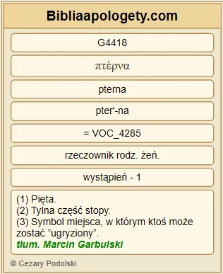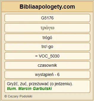 | L07 | J13_18 | Nie G3756 mówię G3004 o was wszystkich G3956 . Ja G1473 wiem G1492 , których G5101 wybrałem G1586 \ lecz G235 [potrzeba], aby się wypełniło G4137 Pismo G1124 : Kto G3588 ze Mną G3326 spożywa G5176 chleb G740 , ten podniósł G1869 na Mnie G1909 swoją G846 piętę G4418 . |