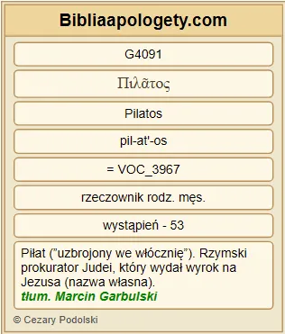 | L07 | J18_35 | Piłat G4091 odparł G611 : Czy ja G1473 jestem G1510 Żydem G2453 ? Naród G1484 Twój G4674 i arcykapłani G749 wydali G3860 mi Ciebie G4571 . Co G5101 uczyniłeś G4160 ? |