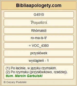 | L07 | J19_20 | Ten napis G5102 czytało G314 wielu G4183 Żydów G2453 , ponieważ miejsce G5117 , gdzie ukrzyżowano G4717 Jezusa G2424 , było blisko G1451 miasta G4172 . A było napisane G1125 w języku hebrajskim G1447 , łacińskim G4515 i greckim G1676 . |