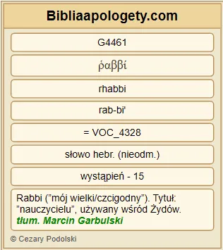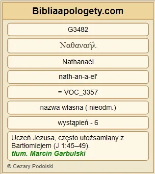 | L07 | J1_49 | Odpowiedział G611 Mu G846 Natanael G3482 : Rabbi G4461 , Ty G4771 jesteś G1488 Synem G5207 Bożym G2316 , Ty G4771 jesteś G1488 Królem G935 Izraela G2474 ! |