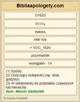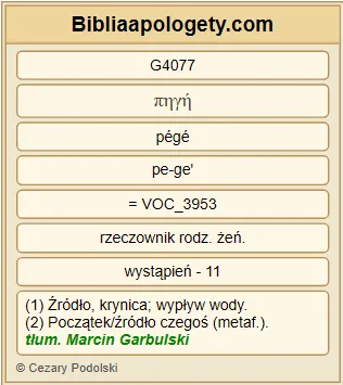 | L07 | J4_6 | Było G2258 tam G1563 źródło G4077 Jakuba G2384 . Jezus G2424 zmęczony G2872 drogą G3597 siedział G2516 sobie przy G1909 studni G4077 . Było G2258 to około G5613 szóstej G1623 godziny G5610 . |