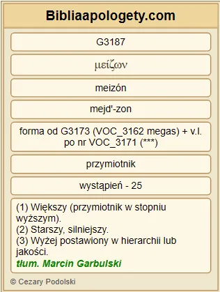 | L07 | J5_20 | Ojciec G3962 bowiem G1063 miłuje G5368 Syna G5207 i G2532 ukazuje G1166 Mu G846 to wszystko G3956 , co On sam G846 czyni G4160 , i G2532 jeszcze G3187 większe G3187 dzieła G2041 ukaże G1166 Mu G846 , abyście G2443 się dziwili G2296 . |