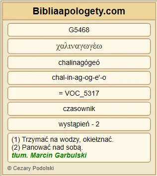 | L07 | Jk1_26 | Jeżeli G1487 ktoś G5100 uważa się G1380 za G1511 człowieka G435 religijnego G2357 , lecz G1161 łudząc G538 serce G2588 swoje G1438 nie G3361 powściąga G5468 swego G846 języka G1100 , to G5124 pobożność G2356 jego G846 pozbawiona G3152 jest G2076 podstaw G3310 . |