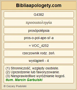 | L07 | Jk2_1 | Bracia G80 moi G3450 , niech G3361 wiara G4102 wasza G5216 w G1722 Pana G2962 naszego G2257 Jezusa G2424 Chrystusa G5547 uwielbionego G1391 nie G3361 ma G2192 względu G4382 na osoby G4382 . |