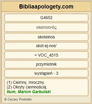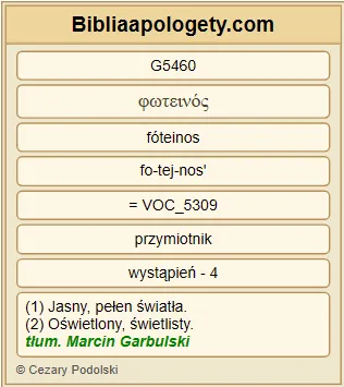 | L07 | Lk11_36 | Jeśli więc G1487 całe twoje G4675 ciało G4983 będzie w świetle G5460 , nie mając w sobie nic ciemnego G3313 G4652 , całe będzie w świetle G5460 , jak gdyby światło G3088 oświecało cię swym blaskiem G5461 G796 . |
