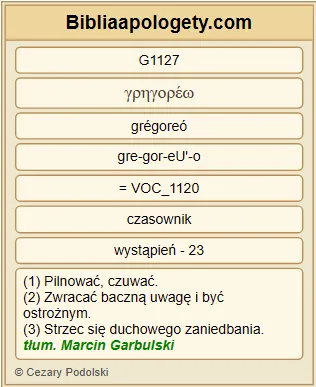 | L07 | Mk13_34 | Bo rzecz ma się jak G5613 z człowiekiem G444 , który udał się w podróż G590 . Zostawił G863 dom G3614 , powierzył G1325 swoim G846 sługom G1401 staranie o wszystko, każdemu G1538 wyznaczył jego G846 pracę G2041 , a odźwiernemu G2377 nakazał G1781 , żeby czuwał G1127 . |