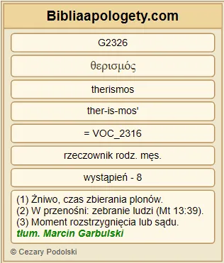 | L07 | Mk4_29 | A gdy G3752 stan zboża G2590 na to pozwala G3860 zaraz G2117 zapuszcza się G649 sierp G1407 bo G3754 pora G2326 już G3936 na żniwo G2326 . |