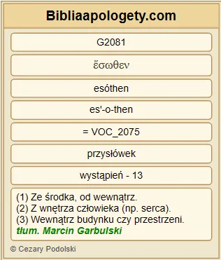 | L07 | Mk7_21 | Z G1063 wnętrza G2081 bowiem G1063 , z G1537 serca G2588 ludzkiego G444 , pochodzą G1607 złe G2556 myśli G1261 , nierząd G4202 , kradzieże G2829 , zabójstwa G5408 , |
