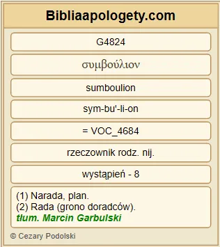 | L07 | Mt12_14 | Faryzeusze G5330 zaś wyszli G1831 i odbyli naradę G4824 przeciw Niemu G846 , w jaki sposób Go zgładzić G622 . |