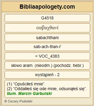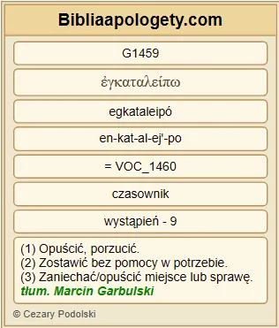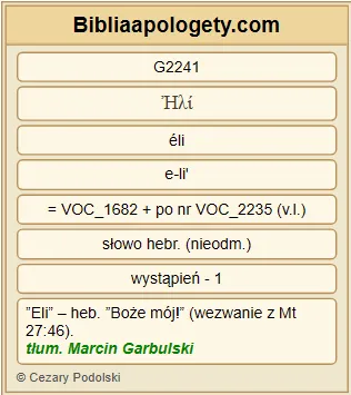 | L07 | Mt27_46 | Około godziny G5610 dziewiątej G1766 Jezus G2424 zawołał donośnym G3173 głosem G5456 : Eli G2241 , Eli G2241 , lema G2982 sabachthani G4518 ?, to znaczy: Boże G2316 mój G3450 , Boże G2316 mój G3450 , czemuś Mnie G3165 opuścił G1459 ? |