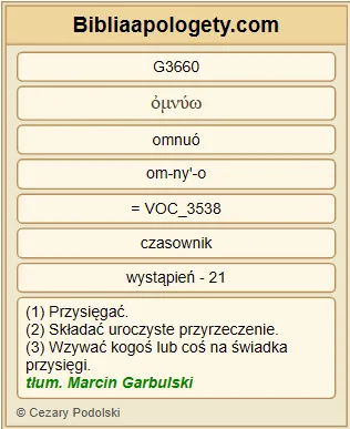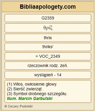 | L07 | Mt5_36 | Ani G3383 na swoją głowę G2776 nie przysięgaj G3660 , bo nie możesz G3756 G1410 nawet jednego G3391 włosa G2359 uczynić G4160 białym G3022 albo czarnym G3189 . |