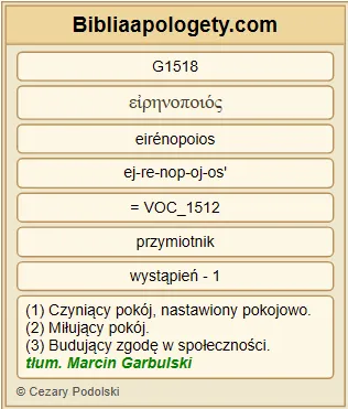 | L07 | Mt5_9 | Błogosławieni G3107 , którzy wprowadzają pokój G1518 , albowiem oni G846 będą nazwani G2564 synami G5207 Bożymi G2316 . |